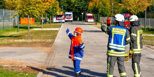 Um 8 Uhr ging es los. Alle Teilnehmer wurden zunächst getestet. Danach wurde zusammen gefrühstückt und gut gestärkt konnten die ersten Einsätze starten. Für den Vormittag standen vier Alarme auf dem Programm. Eine Ölspur, ein vergessenes Lagerfeuer, eine verschüttete Person und ein größerer Stadelbrand. Pünktlich während des Mittagessens kam auch schon der nächste Alarm. Am Nachmittag wurde das Feuerwehrhaus auf Vordermann gebracht und dann ging es mit den nächsten Einsätzen weiter. Auch jetzt waren die Szenarien vielfältig: ein Fehlalarm der BMA (Brandmeldeanlage) des Stadtberger Rathauses, ein Brand in der Turnhalle des TSV Deuringen, eine Türöffnung, eine Person, die von einem Dach springen wollte, ein THL-Wasser-Einsatz und ein Verkehrsunfall standen auf dem Programm. Damit die Einsätze noch realistischer wirkten, wurden Schauspieler für eine realistische Unfalldarstellung engagiert. Die Jugendlichen konnten außerdem erste Einblicke in das Sanitätswesen und die Patientenbetreuung gewinnen.